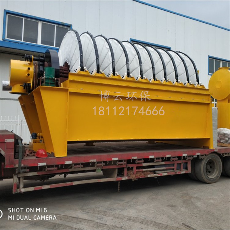 盤式真空過濾機(jī)由各個(gè)單獨(dú)的扇形片的圓盤構(gòu)成。每一個(gè)扇形片為 單獨(dú)的過濾單元,由濾布做成布套在扇形片上形成濾室。過濾盤由電機(jī)通過減速器及開式齒輪傳動(dòng)來驅(qū)動(dòng) ,過濾盤順時(shí)針方向轉(zhuǎn)動(dòng),濾室里的礦漿在吸附區(qū)借助于真空泵在過濾介質(zhì)兩側(cè)形成的壓力差,附著在過 濾盤上形成濾餅后,攪拌器旋轉(zhuǎn)防止固體沉淀,濾餅離開液面后,在真空作用下繼續(xù)脫去水分。濾液透過 濾布,經(jīng)過濾液管,從分配頭排出。濾餅在卸料區(qū)由反吹風(fēng)卸料落入排料槽,整個(gè)作業(yè)過程連續(xù)循環(huán)進(jìn)行 。