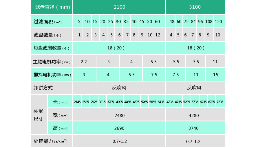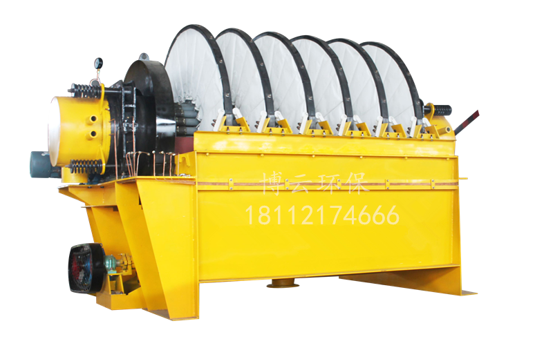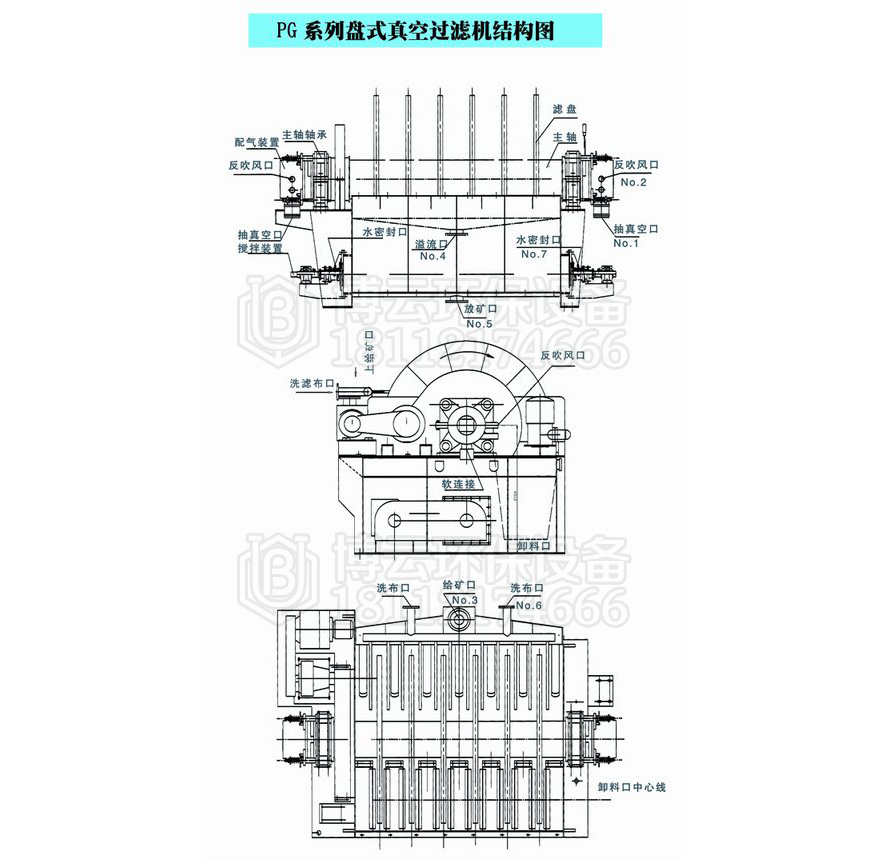 PG系列盤(pán)式真空過(guò)濾機(jī) (1)扇形濾板脫水孔分布均勻,孔率合理,筋條尺寸大,由高強(qiáng)度工程塑料制成,壽命提高了2-3倍。 (2)濾液管過(guò)濾數(shù)面大,分配頭腹腔容積大,提高了抽氣率和濾液排放效果。 (3)耐磨錦綸、單或復(fù)絲濾布使脫餅率高且不易堵塞,使用壽命長(zhǎng)。 (4)多點(diǎn)干油泵集中多點(diǎn)自動(dòng)潤(rùn)滑。 (5)濾布自動(dòng)清洗裝置,保持了其良好的脫水效果。 (6)臥式強(qiáng)制高速攪拌、軸端采用橡膠及石墨盤(pán)根和水壓差三重密封不漏漿。 (7)主傳動(dòng)無(wú)級(jí)變速,依物料的濃度及流量調(diào)節(jié)(交流調(diào)速電機(jī)或變頻器),以求達(dá)到理想的工作效果 。 (8)每盤(pán)由20片扇形板組成,加強(qiáng)了過(guò)濾過(guò)程控制,成餅厚度均勻。 (9)磨擦片采用特制耐磨硼鑄鐵,剛?cè)嵯酀?jì)密封佳,使用壽命達(dá)到十年以上。 (10)濾液管為高強(qiáng)度耐磨陶瓷復(fù)合鋼管,提高壽命10倍以上。 (11)濾液管與濾扇接口去掉下法蘭,采取模具定位直接焊接,減少了90%可能的漏氣點(diǎn)。