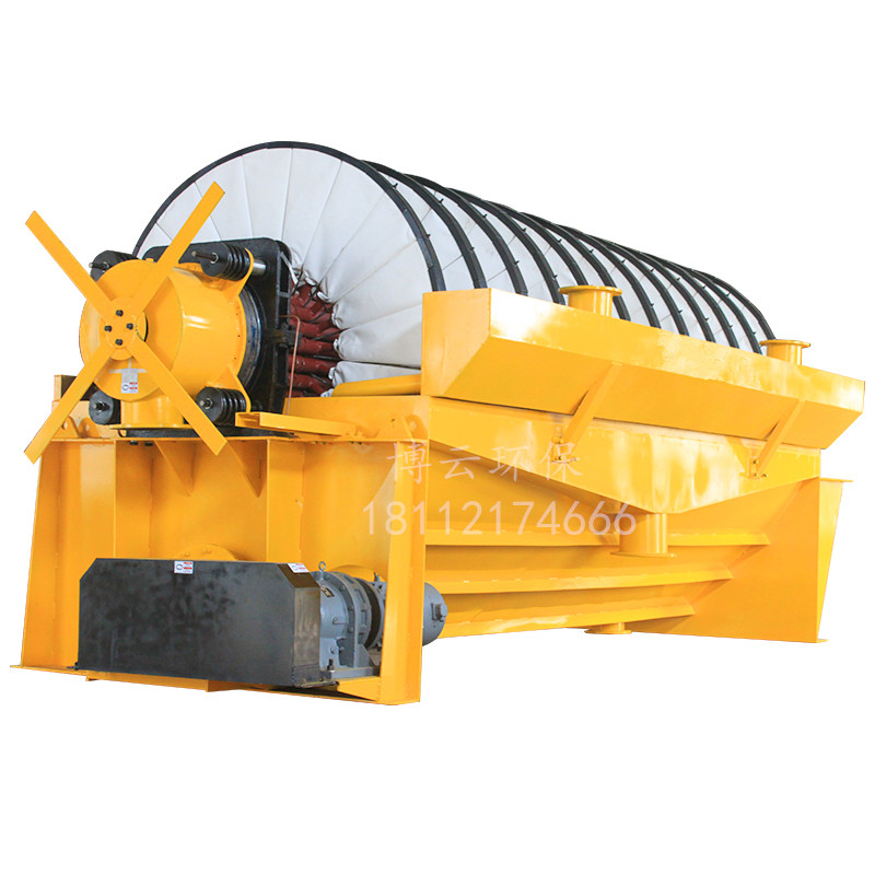 盤式真空過濾機由各個單獨的扇形片的圓盤構成。每一個扇形片為 單獨的過濾單元,由濾布做成布套在扇形片上形成濾室。過濾盤由電機通過減速器及開式齒輪傳動來驅動 ,過濾盤順時針方向轉動,濾室里的礦漿在吸附區(qū)借助于真空泵在過濾介質兩側形成的壓力差,附著在過 濾盤上形成濾餅后,攪拌器旋轉防止固體沉淀,濾餅離開液面后,在真空作用下繼續(xù)脫去水分。濾液透過 濾布,經(jīng)過濾液管,從分配頭排出。濾餅在卸料區(qū)由反吹風卸料落入排料槽,整個作業(yè)過程連續(xù)循環(huán)進行 。